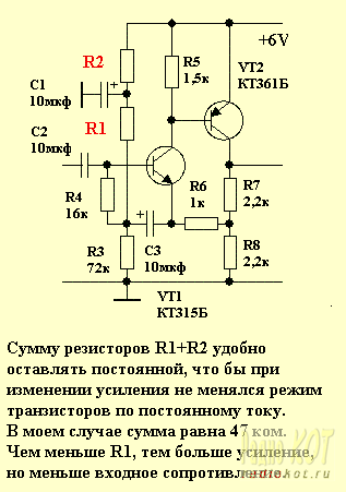 Цитата из статьи. https://radiokot.ru/circuit/analog/games/24/ Как известно усиление, входное и выходное сопротивление данного усилителя зависит от глубины ООС. Её удобнее менять подбором резисторов R1и R2, но оставлять их сумму постоянной. Этим мы избежим изменения режима по постоянному току при изменении ООС. Для удобства в качестве их взял переменный на 47 ком и к средней точке подключил конденсатор С1 по схеме. Резистор R1 в зависимости от коэффициента усиления может быть от сотен ом, до десятка килом. Чем меньше этот резистор, тем больше усиление, но меньше входное сопротивление.