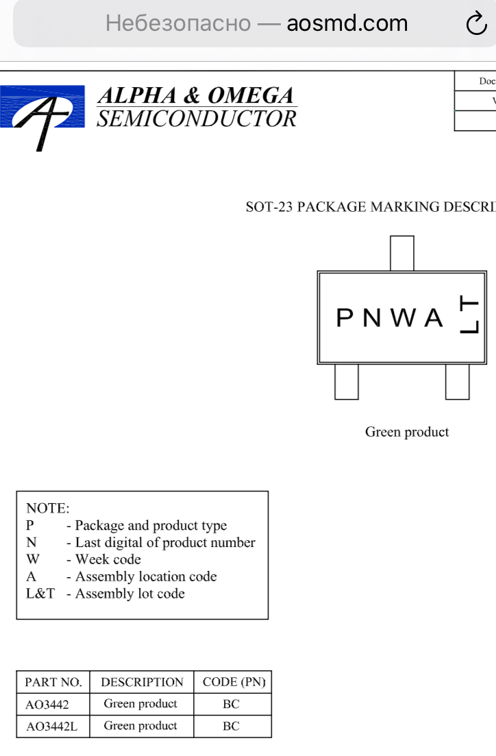 Добавлено after 31 minute 34 seconds: Похоже это действительно ao3442. На сайте компании производителя я нашел расшифровку нанесения смд кодов на их транзистор.