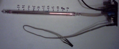 Ну вот, наконец, закончил свою версию термометра на ИН-13. Схему упростил, избавился от ОУ, заюзав АЦП тини13. Благодаря чему плата получилась очень простой и компактной. Это также облегчило калибровку и увеличило точность. Питание - 5в от ненужного зарядника от мобилы. Во вложении схема, прошивка, плата Sprint Layout 5 (Последовательно 7-й ноге тини13 - перемычка. Верхняя деталь, в корпусе TO-92 - 78L05). Перед прошивкой нужно удалить перемычку и, желательно, 555, после - всё вернуть на место. Транзистор VT2 - любой npn(например кт3102), я утянул какой-то SMD с материнки. Питать можно 7-18в. Если питать от 5в, то вместо 78L05 ставится перемычка между крайними выводами. Есть 3 версии прошивки: для уличного термометра от -50 до +50, для комнатного от 0 до +50 и от 0 до +100. Настройка очень проста: включаем термометр, теперь, как можно точнее, в течение 20сек, устанавливаем шкалу на минимальное значение, с помощью R12. После 20сек, шкала погаснет на секунду и снова загорится, теперь устанавливаем её в максимальное положение. Ещё через 20 сек термометр запомнит результат и перейдёт в рабочий режим. Если вам не хватило 20 секунд, чтоб всё точно настроить, обесточите термометр, разрядите конденсатор по питанию или подождите секунд 20 и повторите сначала. Настраивать нужно только один раз, после перебоя питания, если не трогать R12, в силу войдут сохранённые ранее настройки. Перед запайкой МК советую настроить преобразователь. Значения индуктивности дросселя такие: питание 5в - 70мкГн, 10в - 100мкГн, 15в - 150мкГн. Есть идея сделать улично-комнатный термометр: добавить ещё один DS18B20 и двухцветный светодиод , в качестве подсветки индикатора. Когда подсветка синяя - отображается уличная температура, когда красная - комнатная. Также можно избавиться от преобразователя и БП, просто запитав схему от сети, МК и датчики – через гасящий конденсатор, индикатор – через резистор. Развязка, в данном устройстве, не к чему, да и получится гораздо компактнее. Если кому-то нужны исходники стучите в аську. Всё вроде. ---------- Схема пофикшена 13.04.2010 UPD: Тактирование МК 4,8Мгц!