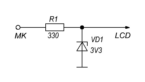 Ещё возникла идея. Поскольку дисплей потребляет малый ток то возможно на него подать питание с +5В только через 2 последовательно включенных диода 1n4148??? Ну и на сигнальных линиях может тоже так сделать?