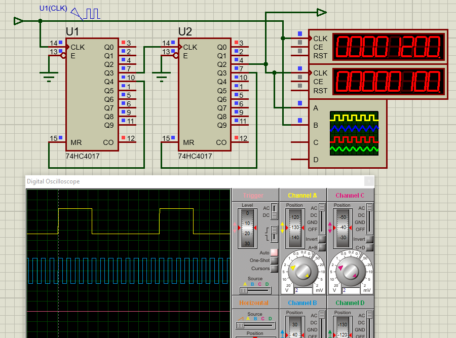 Если не заметили на схеме обычная 4017 (не 74НС4017), частота не 55 MHz, a 55 KHz. В симуляторе нет 74НС4017. А я показал как нужно схему сделать.