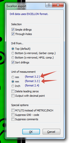 apocalips, посмотрите скриншот - дело в единицах измерения. В этих format 3.2, 3.3, 2.4 (бывают и другие значения). Когда вьювер ожидает, например, 3.4, а ему подсовывают файл сверловки в единицах 2.4 - отверстия в кучу и сбиваются. Или наоборот - растягиваются непропорционально размерам платы. И миллиметры\дюймы, разумеется, важны тоже.