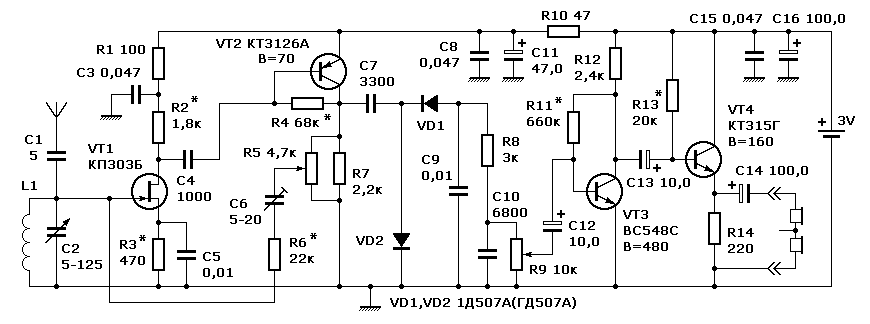 Вместо резисторов R5 и R7 должен стоять один переменник на 1.5 килоома, но у меня такого нет под рукой, поэтому сделал так. Транзистор VT2 должен быть ВЧ с малыми паразитными емкостями, чтобы регенерация по диапазону была равномерной, у меня был КТ3126А, его и поставил, он к тому же малошумящий, КТ361 здесь будет работать плохо. Если вместо КТ3126А будет транзистор с другой бетой, то видимо надо будет дополнительно подбирать R6. Транзистор VT3 надо ставить с максимально возможной бетой, 700-1000, но у меня такого нет. Катушка L1 намотана на бумажном цилиндре из ватмана, диаметром 19 мм, который я склеил клеем ПВА, витки наматывались проводом 0.5 мм в два провода. Потом один провод снял, получилась намотка с шагом. Катушку в нескольких местах промазал поперёк витков клеем ПВА, всё держится крепко. Всего витков 13. Переменный конденсатор у меня воздушный, две секции, по 250 пф каждая, я включил их последовательно, получился переменник на 125 пф. Добротность у контура получилась высокая, он перекрывает три вещательных диапазона. Настройка острая, поэтому тут нужен в параллель ещё небольшой воздушный переменник для точной настройки. Невоздушный переменный конденсатор в этой схеме работает плохо, я проверял. К контуру в качестве антенны через конденсатор 5 пф подключен провод длиной 80 см.