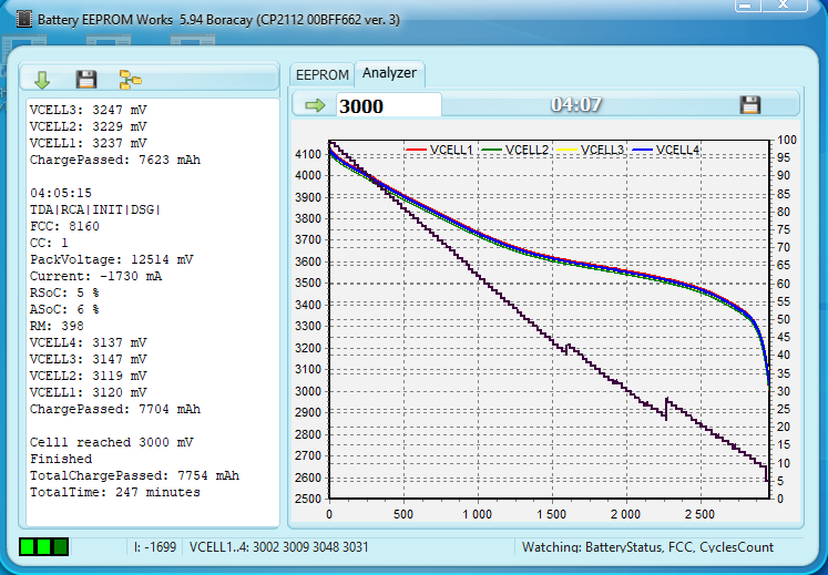 Николай967, Ноут опознал батарею и пошла зарядка. Зарядилась до 100 %. После отключения питания проработал около 5 минут и выключился. С этого момента ключи не открываются. Уже разных попыток было около десятка. Так надо было сохранить ЕЕпром рабочий... А вообще похоже на сильный дисбаланс по Секциям - вот и залочилась Это моё предположение... В переписке отчеты рабочие - Напряг и ток по заряду есть Проблемы могут быть в самой плате