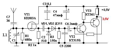 Тогда имеет смысл сопротивление поставить побольше. Тогда снизиться потребляемый ток, но как уже сказали громкость будет меньше. А вообще УНЧ можно любой поставить, большой разницы в этом нет. УНЧ в данной приемнике совсем не главное. Главное здесь колебательный контур, Каскад на полевом транзисторе, а дальше можно ставить, что хочешь. Например TDA2822M, TDA7050, mc34119, LM386, если питание нужно низкое или любую другую если повысить напряжение питания. Тогда можно поставить даже низкоомный динамик. В принципе здесь просто проверялся вопрос какой можно сделать простейший приемник в настоящее время вместо детекторного, что бы он заработал и не было больших проблем с настройкой. Нового я ничего не придумывал. Просто взял старые идеи сказанные другими и проверил их на практике.