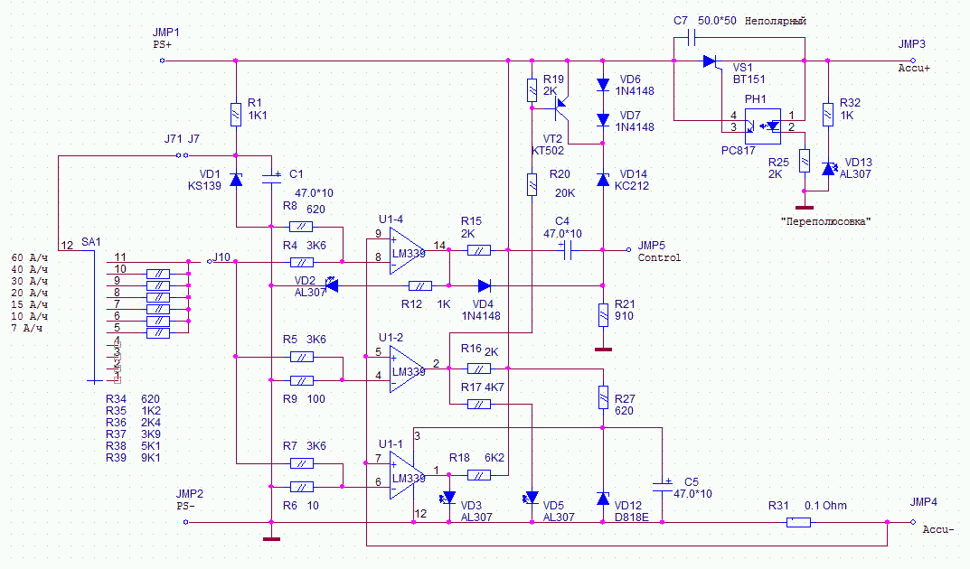KomSoft за схему и плату спасибо, как переделать авторскую плату я понял, а вот с деталями ситуация куда хуже, из резисторов представленных на упрощенной вами схеме у нас магазинах не нашлось ни одного, из диодов только 1N4148, из остальных деталей нашлись только оптрон, тиристор, транзистор, светодиоды и все. Нашел в инете упрощенную схему, может с ней чего выйдет.Не подскажите какова сила зарядного тока на этой схеме? можно врезанием в разрыв желтого провода резисторов различной емкости регулировать силу тока? просто мне надо еще и аккумуляторы меньшей емкости заряжать(9а/ч, 4.5 а/ч).