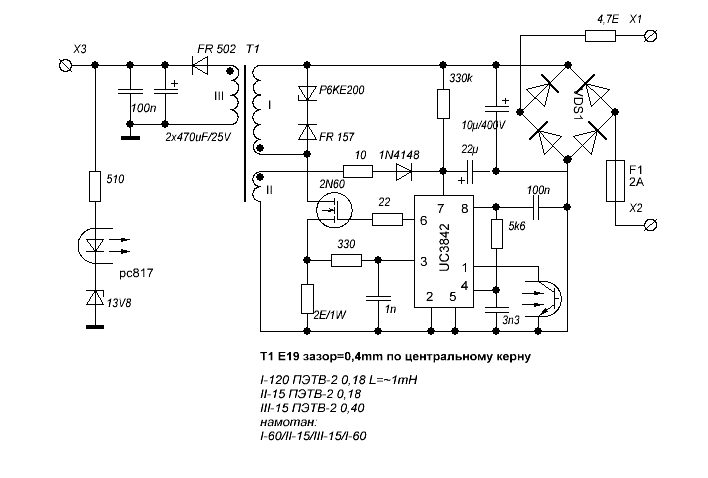 Начинать со схемы на gdt явно не стоит. Схемы на UC3842 (обратноход) почти идентичны, отличаются только параметры обвязки и ключи. Автору советую повторить схему, разобравшись в ней, а потом уже задавать вопросы, если что-то не получилось. Ну, или спросить перед сборкой, что непонятно.