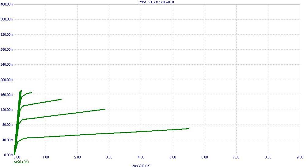 А вот снятые мной вольт-амперные характеристики модели транзистора 2N5109, spice данные которой мне помогли найти viewtopic.php?f=21&t=16155&start=20 . Я внес их в программу Micro-Cap. Эта программа умеет создавать spice модель из текстового файла, а также может основываясь на данных из справочника. Для этого там есть специальный component editor. Первая ВАХ снята без сопротивления Rэ: