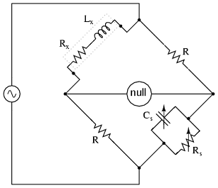 Эта мостовая схема известна как мост Максвелла - Вина (иногда её называют мост Максвелла ), она используется для измерения неизвестных индуктивностей с помощью калиброванных резистора и конденсатора.