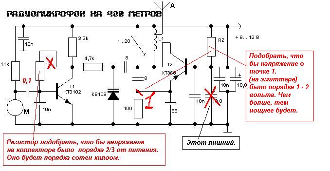 Вот на двух транзисторах. Схема стандартная и никакой новизны в ней нет. Схема подобна, что в статье на форуме http://radiokot.ru/circuit/analog/receiv_transmit/07/ Только устранены некоторые неточности и применены другие транзисторы. Вместо древнего p-n-p транзистора П416 поставил КТ368 (КТ316, КТ325) Подойдут любые транзисторы с Fт не менее 700 мГц, которых много и среди импорта. Питание 3 вольта. Стабильность конечно не очень. За антенну хвататься нельзя. Когда за антенну хватаешься, частота уходит на 3 мгц. Чувствительность по микрофону хорошая. Наверное это из-за применения транзистора КТ3102Г.