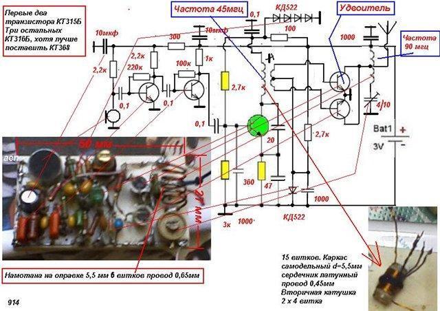Вот рабочий макет жучка на пяти транзисторах.
