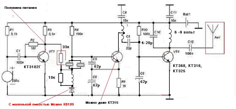 Вот на двух транзисторах. Схема стандартная и никакой новизны в ней нет. Схема подобна, что в статье на форуме http://radiokot.ru/circuit/analog/receiv_transmit/07/ Только устранены некоторые неточности и применены другие транзисторы. Вместо древнего p-n-p транзистора П416 поставил КТ368 (КТ316, КТ325) Подойдут любые транзисторы с Fт не менее 700 мГц, которых много и среди импорта. Питание 3 вольта. Стабильность конечно не очень. За антенну хвататься нельзя. Когда за антенну хватаешься, частота уходит на 3 мгц. Чувствительность по микрофону хорошая. Наверное это из-за применения транзистора КТ3102Г.