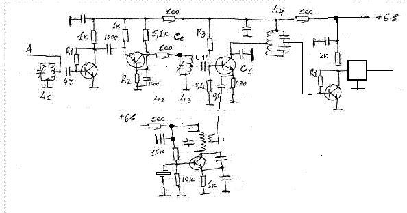 Пишу как бя я сделал в данном случае. Осциллограф подключить как на картинке. Вращать L1и L3 добиваясь картинке как можно красивее, но при этом смотреть на амплитуду. Если картинки хорошей не получается, значит мала добротность контура L1 или он слишком здорово нагружен последующим каскадом. Можно или уменьшить L2 или средний вывод включить через резистор в десятки Ом. Небольшая ассиметрия сигнала большой роли не сыграет на таких незначительных мощностях и можно особо не заморачиваться. Еще для предотвращения этого лучше поставить удвоитель на двух транзисторах. Я всегда так и делаю. При этом и мощность поднимется. Он вместо каскада на VТ4 ставится. Картинки ниже нарисовал. viewtopic.php?p=695502#p695502