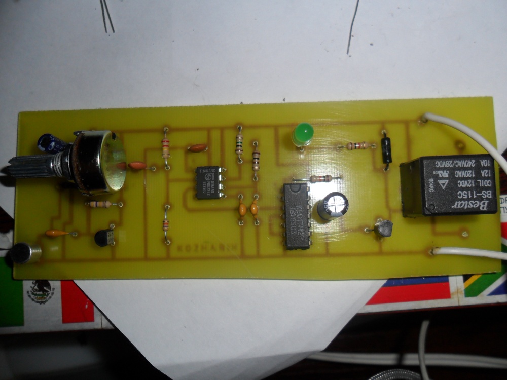 симптомы следующие: 1. издаеш звуки не работает ... 2. касаешься корпуса микрофона ... загораеться светодиод - реле не переключаеться.... 3. замыкаешь екмитер и коллектор ... загораетьс светодиод и переключаеться реле...