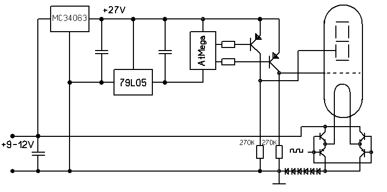 Помню, как питал сам вакуумник и его накал от одного источника. Структурная схема примерно такого рода: Заключалось в следующем: Резистором подбираем силу тока такую, чтобы при открытом транзисторе нить накала слегка светилась. При таком раскладе будут светиться только те разряды, которые ближе к минусовой точке нити катода, так как на другом конце преобладает положительный потенциал. Если на базу транзистора подать пульсирующий ток, то положительный потенциал исчезнет во время спада, но нить ещё горячая по этому начинают светиться все разряды. Потом снова короткий импульс подогрева и длинный спад. В виду высокой частоты, глазам не будет виден эффект мерцания. Этот вариант у меня успешно работал.