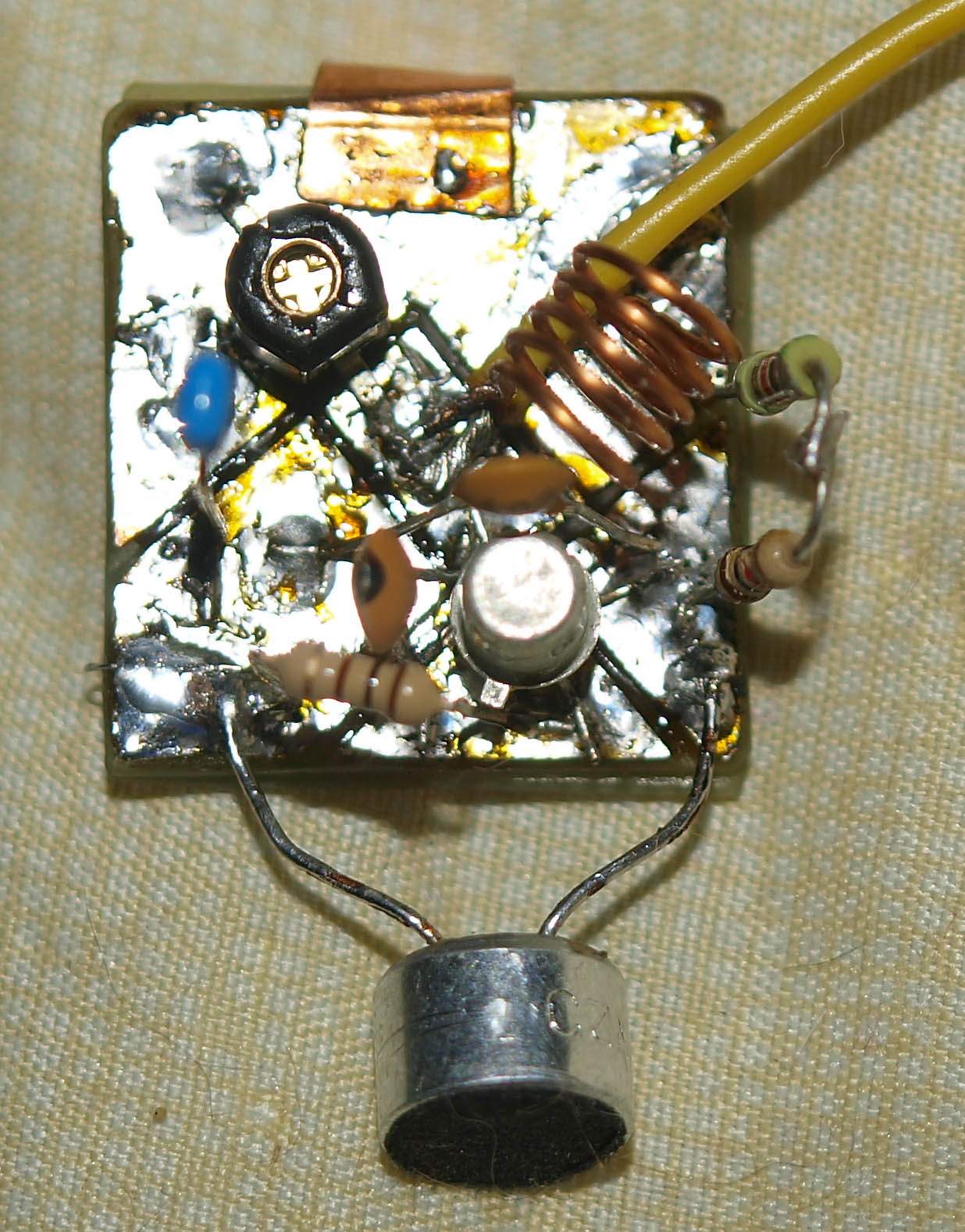 Люди, вопрос есть - собрал по этой схеме жука, он вроде как работает, потому что я на некоторых частотах слышу, что идет от микрофона. Но сигнал крайне неустойчивый - иногда даже зависит от положения тела в пространстве, не говорю уже о том, чтобы жука перенести на другое место. Понятно, что это могут быть паразитные резонансные частоты, но в диапазон 87,5-108 МГц я не попадаю по ходу дела. Схема внизу, фото жука, некоторые нюансы - питается не от литиевой, а от обычных пальчиковых батареек (нет пока в доступе литиевой). Ток на входе, как по первоначальной ссылке показано, измерял - либо мультик глючит, либо там совсем ничтожные количества - показывает ноль. Но напряжение на R2 0,72 в, на R1 - 1,69, на транзисторе - Б-Э - 0,48, Б-К - 1,63, Э-К - 2,15 в. и кондер один - по схеме он С4, 15 пФ, я такого не нашел, впаял на 10пФ - он на что влияет? Пытался уже и подстроечным кондером найти частоту - никак... Какой будет диагноз?