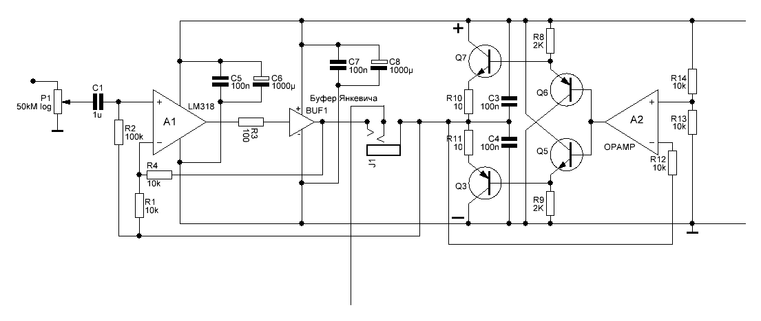 Ну в вашем электронная быстродействующая стабилитзация тока покоя местной ОС.И весьма большое входное сопротивление Вк ,а следовательно выходной каскад ОУ работает в линейном режиме А с минимальными искажениями.У меня входное сопротивление ещевыше ,а также применен параллельный ВК с токовым шунтом,который дополнительно снижает искажения.Да и входное сопротивление 3каскадного параллельника весьма велико,что позволило применить скоростной оу .