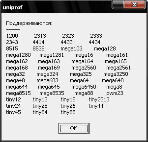 Чтобы выяснить список поддерживаемых МК, нажимаем на F3. (UniProf) Вот список поддерживаемых устройств версией 2010:
