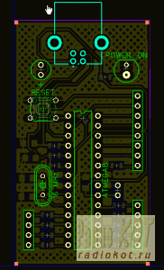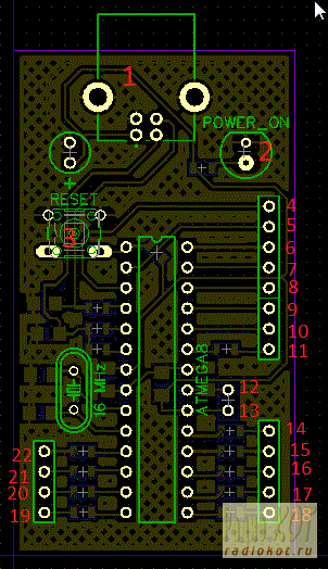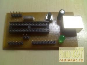 Почему я выбрал именно HID, а не виртуальный COM порт (CDC)? Во-первых, не нужны драйвера, во-вторых, HID в несколько раз меньше грузит микроконтроллер, чем CDC, так как данные запрашиваются не постоянно, а только тогда, когда этого требует хост (компьютер), и вообще, COM порт уже отмирает, сейчас аппаратных COM портов уже практически нет, остались только виртуальные. Логические линии вывода предназначены для управления только двумя состояниями – включенный или выключенный, при выключенном на выходе (ножке микроконтроллера) будет 0В при включенном – 5В, сюда вы можете подключить просто светодиод и управлять ним с ПК, а можете подключить реле (через транзистор) и управлять более мощной нагрузкой (освещение и т.д.). Линии вывода с регулировкой напряжения (ШИМ выход) позволяют плавно менять напряжение на ножке микроконтроллера от 0В до +5В с шагом 5/1024В. Линии ввода с логическим состоянием предназначены для мониторинга состояния кнопок, ключей и т.д. Когда линия замкнута на землю (корпус, GND), ее состояние = 0, если не замкнута – 1. АЦП позволяет измерять напряжение, сюда можно подключить потенциометр, аналоговый термодатчик, или еще что то, только напряжение, на этой ножке не должно превышать напряжение питания. В качестве источника опорного напряжения для АЦП можно использовать как внешний ИОН, так и напряжение питания модуля. Чтобы при перепрошивке не приходилось подключать микроконтроллер к программатору, сделаем возможность заливки прошивки прямо через USB, без использования внешнего программатора. Схема устройства: Как видите, схема достаточно проста, только коннекторы я прикрепил на схеме не по порядку, это потому что у ATmega8 ножки каждого порта, почему то расположены в разброс, зато на самой плате будет выглядеть красиво. Печатная плата: Ну и в результате получилось вот что: Теперь разберемся, что куда будем подключать.