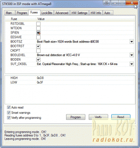 Первые две строчки – это ID устройства и ID продукта, такие есть у каждого USB устройства, только в этом файле указывается сначала младший байт, потом старший, в программе под компьютер – наоборот. Дальше идет имя производителя (вендора) и название устройства, также указывается длина строки в байтах. Программа ПК сначала будет искать устройств по ID и потом, среди найденных, будет искать по имени. Прошивка устройства. В скачанных файлах в папке MCUusb_bootloader найдите файл main.hex – это usb-bootloader, его нужно залить в МК с помощью внешнего программатора. После заливки также нужно правильно установить фьюзы, в окне программатора STK500 должно выглядеть так: Если вы пользуетесь другой программой, то можете просто ввести значения фьюз-битов HIGH и LOW (смотрите на скрин). После удачной прошивки, можно попробовать прошить устройство через бутлоадер. Как он работает? При включении МК (просто при подаче питания, или после ресета) сразу запускается бутлоадер, он проверяет условие, если оно истинно, то запускается инициализация бутлоадера (компьютер при этом находит устройство). В качестве условия у нас будет «Логический вход 1 = 0″, то есть, чтобы запустить бутлоадер, нужно замкнуть Логический вход 1 на GND и нажать на устройстве кнопку RESET, в диспетчере устройство должно появиться новое HID устройство, так же не требующее драйверов: Такс, теперь в папке MCUUSB_Controldefault запускаем файл boot.bat, должно выскочить окошко, в котором будут бегать циферки: Если окно сразу же закрылось, тогда вы сделали что то, не правильно. Если же все ок, тогда внешний программатор для этого устройства Вам уже не понадобится. Теперь можете отключить Логический вход 1 от GND. И на всякий случай, нажмите RESET. В диспетчере устройств так же должно появиться HID устройство (компьютер напишет, что найдено новое). Убедитесь, что в диспетчере появилось именно это устройство. Хост – это то, что будет управлять устройством, в нашем случае – компьютер. Управление устройством с ПК я опишу более подробно. Для программистов Delphi написать программу управления HIDом не составит проблем, так как в интернете куча информации. А вот программистам C++ Builder не все так сладко, но, как оказалось, не так все и плохо. В интернете я нарыл библиотеку hidlibrary.h, вот с ее помощью мы будет работать с HID устройством. Скачайте исходники и запустите USB Control.cbproj (C++ Builder 2010). В файле hidlibrary.h в самом верху есть строка