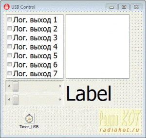 Создадим форму, на форме будет один CheckListBox для управления логическими выходами, 2 ScrollBar для управления ШИМ каналами, один ListBox для отображения логических входов, один Label для отображения состояния АЦП и один таймер. Должно получиться вот такое: Переименуйте СкрулБары в ScrollBar_PWM1 и ScrollBar_PWM2, в их свойствах установите Max=1023. Создадим структуру