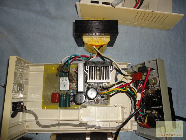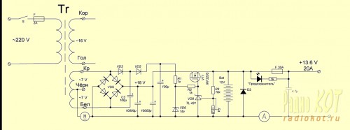 Автор: Rover Очень часто задаётся вопрос: «От чего запитать автомобильную аудиоаппаратуру дома?» Наверное, самый распространённый ответ – использовать комповый БП АТХ. Ибо доступно. Вот только импульсный источник питания да ещё и с ШИМ – не самый лучший вариант, поверьте. Чуть подправить ситуацию можно небольшой доработкой – поднять его Uвых. с 12V до 13.6V и в буфер поставить 7-9 а/ч AGM АКБ от UPS. Импульсные возможности возрастут, помеха от ШИМ уменьшится. Останется «небольшой» вопрос - как всё это оформить, чтобы без соплей, проводов, в нормальном корпусе, да ещё желательно и с индикацией работы. «Небольшой» я спецом в кавычки взял, ибо не помню – «замаешся» с мягким знаком пишется или без . Вместо БП АТХ можноподобрать что-то получше : Те же проблемы с шумами ШИМ, но доступно, и помощнее. Для гаража сойдёт . Ещё один из вариантов – зарядное устройство с авто с АКБ в буфере мы рассматривать не будем, ладно? Есть ещё один неплохой вариант – использовать 12V трансформатор (не электронный!) для запитки бытовых галогеновых светильников: Ну, и наконец, предлагаю вашему вниманию ещё один доступный вариант (читаем название темы). У меня давно валялся на складе никому не нужный бесперебойник – ибо провинился: запоганил две внутренних АКБ, что то там с контроллером зарядки. Т.к. он импульсный, с SMD монтажом, то возиться с ним никто не стал, проще было новый купить, не велика потеря. Вылежав своё, пошёл на «препарирование». Он там 300W, надо посмотреть что на обмотках. Переворачиваем: т.е. обмотку, которая нам выдавала 220V, инвертировав его с АКБ, мы подключаем в сеть (совет: последовательно с обмоткой включите любую лампочку на 220V - убережёт от косяков) она ни гореть, ни моргать не должна. На двух вторичных обмотках мы имеем 16,6 и 14 V. Ту, которая намотана более толстым проводом, и имеет отвод от середины, мы и будем использовать. Схема разрабатывалась из расчёта, что всё что есть, можно «наковырять» из подручных средств – старых БП АТХ, или из самой платы UPS: Электронной защиты не применяется, она тут не нужна, вся защита осуществляется предохранителем, и более чем двукратным запасом силовых элементов по току. Без АКБ схема выдаёт ток до 20А с просадкой по напряжению до11.2V. Испытывалось на сложной нагрузке - мощном автокомпрессоре в течении 10 мин. Трансформатор и радиатор диодов нагрелись примерно до 45 градусов надо будет обдувать. При подключенной в буфер АКБ UPS схема легко выдала 30А, при просадке до 11.6V. Т.к. АКБ была полудохлой, дальше нагружать не стал. Для питания автомобильной аппаратуры дома нам этого хватит- нагрузка УМ в основном импульсная. АКБ в буфере хороший фильтр, так что можно оформлять в «готовое изделие», но прежде, посмотрите на схему трансформатора: там есть ещё одна гальванически развязанная обмотка на 16.6V, что добру пропадать? Лабораторный регулируемый БП дома ещё никому не вредил, поэтому вторую обмотку мы отдадим под него. Схема разрабатывалась по тому же принципу - из подручных средств. Корпус тоже «переворачиваем» - то что было мордой станет«попом» и наоборот. Разъёмы 1-4 тоже освобождаем, дырки будем заполнять чем надо. Все вопросы в Форум.
