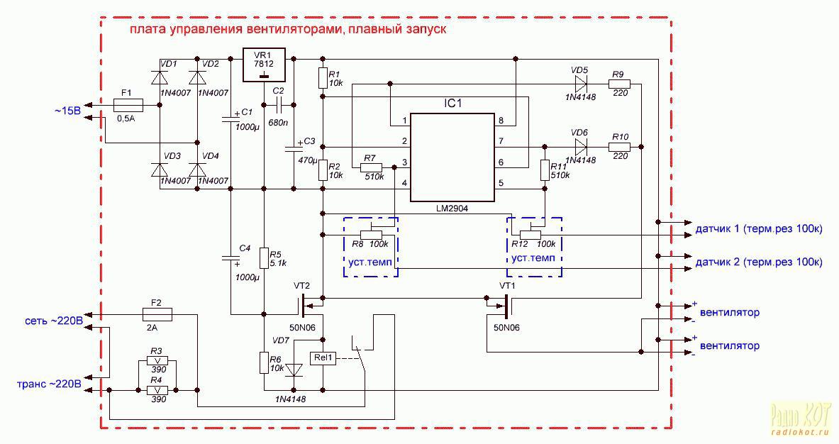 Схема управления вентиляторами, построена на сдвоенном ОУ LM2904, отслеживая изменение напряжения на делителях с терморезисторами (датчики), и сравнивая его с опорным заданным резисторами R1, R2, включает вентиляторы при заданной температуре, порог срабатывания устанавливается подстроечными резисторами R8, R12.