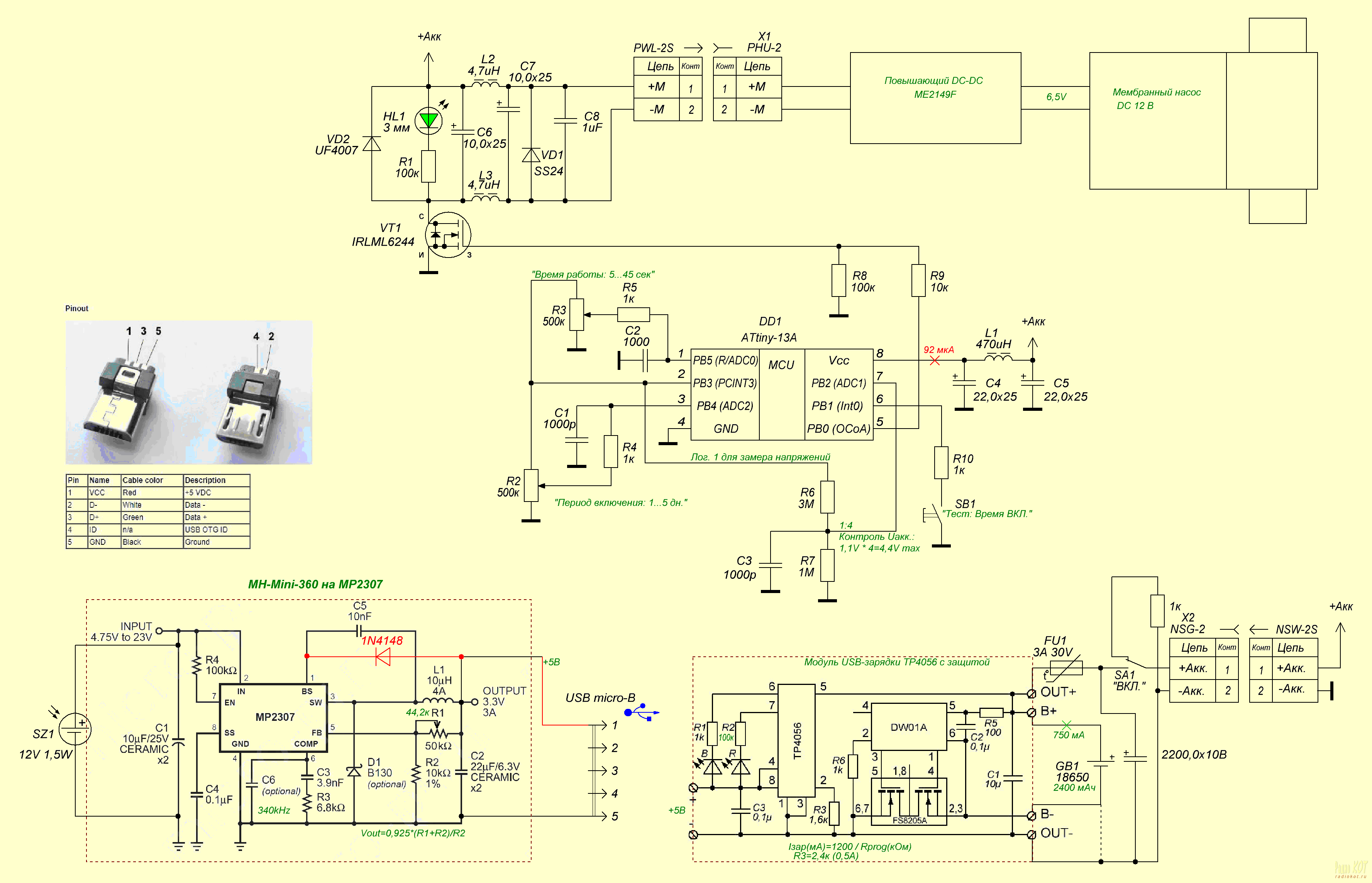 Выходная мощность модуля составляет 8 Вт. При выходном напряжении 6,5 В ток нагрузки составляет 8W/6,5V=1,23А. Потребляемый насосом ток при напряжении 6,5 В составляет около 0,35А, так что имеется запас по току в 3,5 раза. Можно использовать любой другой повышающий преобразователь, работающий от литиевого аккумулятора и рассчитанный на выходной ток ≥1А при выходном напряжении 6,5В.