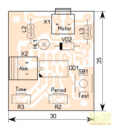 Схема контроллера собрана на печатной плате из одностороннего фольгированного стеклотекстолита габаритами 30х35мм: