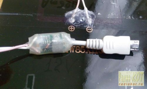 Модуль зарядки установлен разъёмом наружу также на термоклей.