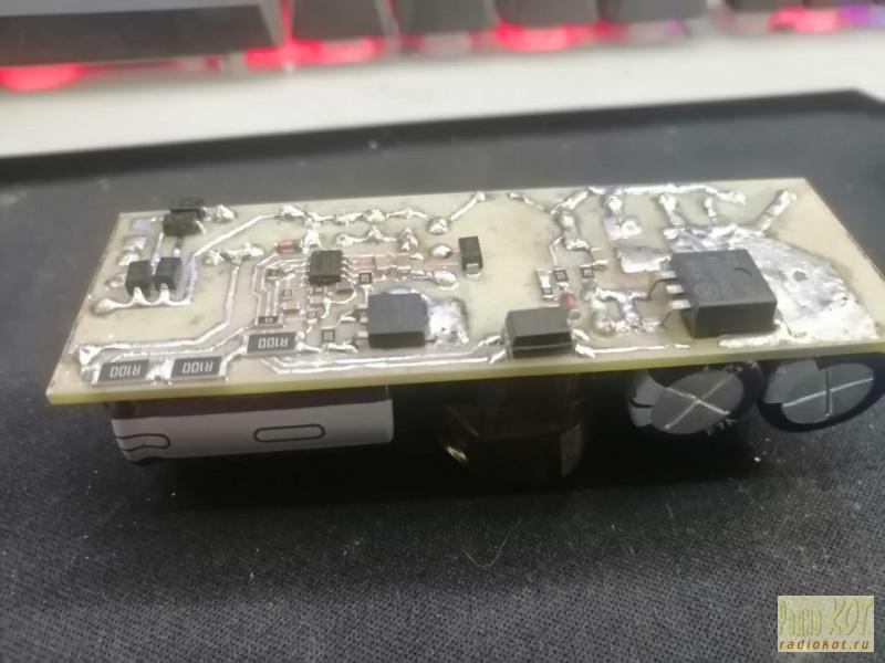 Из спортивного интереса за ночь был разработан и собран преобразователь 220-12В. Есть у меня некоторое количество всяких разных микросхем закупленных на всякий случай. Среди них нашлись UC3845, на которых я еще ничего не собирал. Раньше обратноходы собирал на TOP в основном. В качестве ключа был выбран так-же имеющийся 06N80 в смд исполнении. Такая компоновка преобразователей мной уже многократно испытана, включая заказы ушедшие в серию. Все активные элементы распологаются на нижней стороне платы. Все массивные элементы в выводном исполнении сверху. Плата устанавливается на алюминиевую пластину через теплопроводящий клей или "терможевачку". Так получается максимально компактная и удобная сборка. Что-то похожее встречается в пластиковых БП для ноутбуков, например. Преобразователь работает на частоте около 420кГц. Что позволяет использовать достаточно компактный трансформатор. Вид снизу: