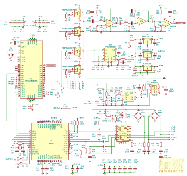 Прибор для измерения скорости и направления ветра без использования подвижных компонентов. В основе, измерение фазовых изменений при прохождении звуковой волны в подвижной среде. Для измерения используются приемо-передатчики работающие на частоте 40кГц +/- 1%. Теория крайне проста: измеряется фазовый сдвиг в противоположных направлениях, разница пропорциональна скорости среды. Прибор реализован на stm32f103c8t6. Для измерения задействованы четыре таймера. Данные регистрируются в zabbix. Для работы прибора требуются: PoE IEEE 802.3af 100Mb коммутатор, сервис DHCP, сервер Zabbix. Питание и передача данных выполняется по ethernet кабелю. Настройка сетевых параметров задается посредством DHCP сервера. Собранный прибор требуется калибровать. Процедура калибровки автоматическая, выполняется в отсутствии движения воздуха. Результат калибровки сохраняется во FLASH контроллера. Для повторения прибора кроме монтажа электроники, необходимо изготовить корпус по заданным размерам. Опыт эксплуатации корпуса выполненного на 3D принтере, пластиком PETg, показал удовлетворительный результат. Примененные излучатели и модель корпуса предполагают использование силиконовых колец в качестве прокладок, для уменьшения влияния колебаний передаваемых через пластик. Вся необходимая для повторения информация и исходники размещены на Github В каталоге Release, можно взять архив с gerber, прошивкой и 3D моделями. Настройка сервисов (DHCP, Zabbix) и прибора описана на Wiki странице проекта. На данном ресурсе эту информацию не размещаю, поскольку проект будет развиваться и возможны изменения. Тестирование выполнялось с помощью механического анемометра и показало сопоставимые результаты. Говорить о какой то точности не берусь, для этого нужно профессиональное оборудование. Теоретический предел скорости среды для данной конструкции и выбранного алгоритма обработки -- 30 м/с. Статью публикую с надеждой получить полезный опыт от общения с более компетентными специалистами.