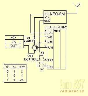 Для универсальности устройства и возможности подключения к любым часикам, имеющим функцию ручной коррекции хода часов, в схеме предусмотрена возможность с помощью двух перемычек S1 и S2, подключающих выводы 2 и 4 микроконтроллера к минусу питания, выбрать нужное количество сбросов за сутки (1,3 или 24). По умолчанию, если перемычки не установлены сигнал сброса формируется каждый час, когда показания минут и секунд спутникового времени UTC равны нулю. На схеме устройства показана таблица количества сбросов от состояния перемычек.