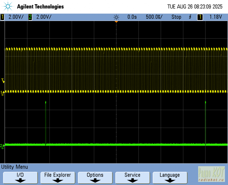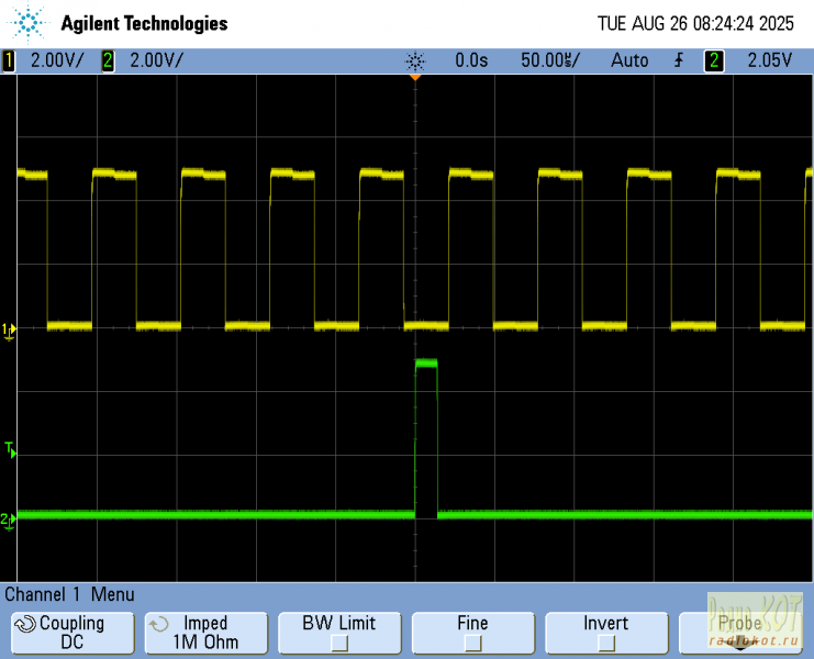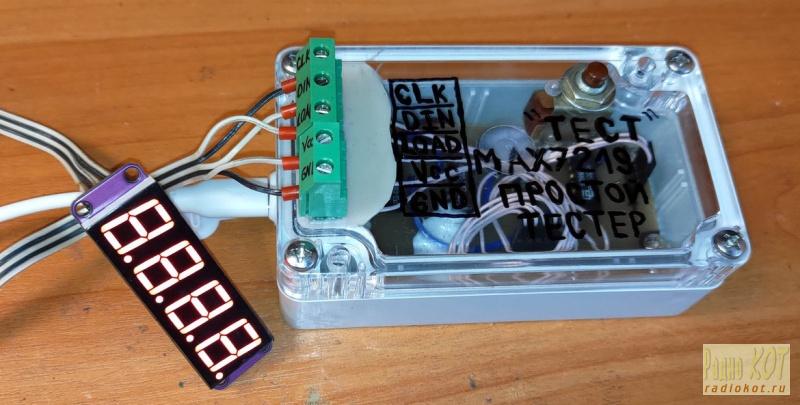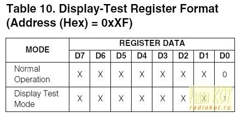 И вот, допустим, купили вы такой модуль на условном Алиэкспрессе, или сделали свою плату самостоятельно. Как проверить, что всё более-менее работает? По крайней мере, что горят все светодиоды? И с этим есть нюанс: если вы просто подадите питание на плату, ничего не произойдёт. По умолчанию, без инициализации, MAX7219 остаётся в выключенном состоянии и никакой индикации выдавать не хочет. Явно нужен микроконтроллер, чтобы разбудить его...или всё же можно обойтись без него? Попробуем разобраться. Для чего снова обратимся к даташиту. К списку регистров чипа. И видим в нём весьма интересный регистр под названием "Display test". Да, это как раз специально заложено для тестирования сборки на исправность. Если сделать запись в него, то чип зажигает все светодиоды с максимальной яркостью. Вот бы нам сделать правильную запись в этот регистр. Видно, что последовательные данные вкачиваются в интерфейс по переднему фронту импульсов CLK, начиная со старшего бита. Всего слово данных составляет 16 бит. По переднему фронту сигнала LOAD данные, которые к тому времени успели влезть во входной буфер интерфейса, перебрасываются во внутреннюю логику чипа и выполняются им. Кстати про буфер: он представляет собой сдвиговый регистр (или FIFO, если хотите). Если до момента прихода импульса LOAD мы попытаемся залить в него более 16 бит, то лишние биты начнут вылезать с противоположной стороны через выход DOUT. Именно это используется для каскадного включения: просто закачиваем последовательно столько 16-битных слов, сколько чипов висит в цепочке, и общим сигналом LOAD одновременно отправляем код на выполнение. Теперь посмотрим, как нам через всё это добраться до регистра Test: Любопытное дело: из 16 бит пакета используется, по сути, только 12! 4 бита на адрес регистра, да 8 бит для данных, которые мы хотим залить в регистр. А старшие биты могут быть какими угодно, они не на что не влияют. А если почитать повнимательнее про содержимое регистра Test: Ну надо же, как много "иксов"! Т.е. битов, которые вообще ни для чего не используются. И лишь самый последний бит определяет, будет ли включен тестовый режим. А если ещё учесть, что адрес нашего регистра ни что иное, как F, т.е. все единицы, это недвусмысленно намекает на способ изрядно всё упростить: необязательно как-то осмысленно формировать поток данных, достаточно просто повесить линию данных на Vcc! Ещё раз подчеркнём, что таким способом мы можем, к сожалению, только включить режим "Тест". Чтобы выключить его, а также сделать ещё что-либо, придётся формировать адекватные данные. Кстати, а что будет, если линию данных повесить на землю и закачать всё это в чип? Если аналогично проанализировать то мы получим запись нуля в регистр "No-op", который делает...ничего! И не важно, что конкретно при этом мы в него записываем. Это имеет смысл для ситуации каскадного включения чипов, когда мы хотим что-то изменить, скажем, в последнем чипе цепочки, не затрагивая регистры предыдущих. Вот так получается, что по минимуму нам остаётся всего лишь сформировать тактовые импульсы, да вставить через нужное их количество импульс LOAD. Данное количество в минимальном варианте составляет 16, но мы же помним про возможность соединять чипы "паровозиком"? Так что сделаем, пожалуй, 64 импульса, чтобы прокачать командами Test хотя бы 4 объединённых индикатора, вряд ли на практике потребуется бол