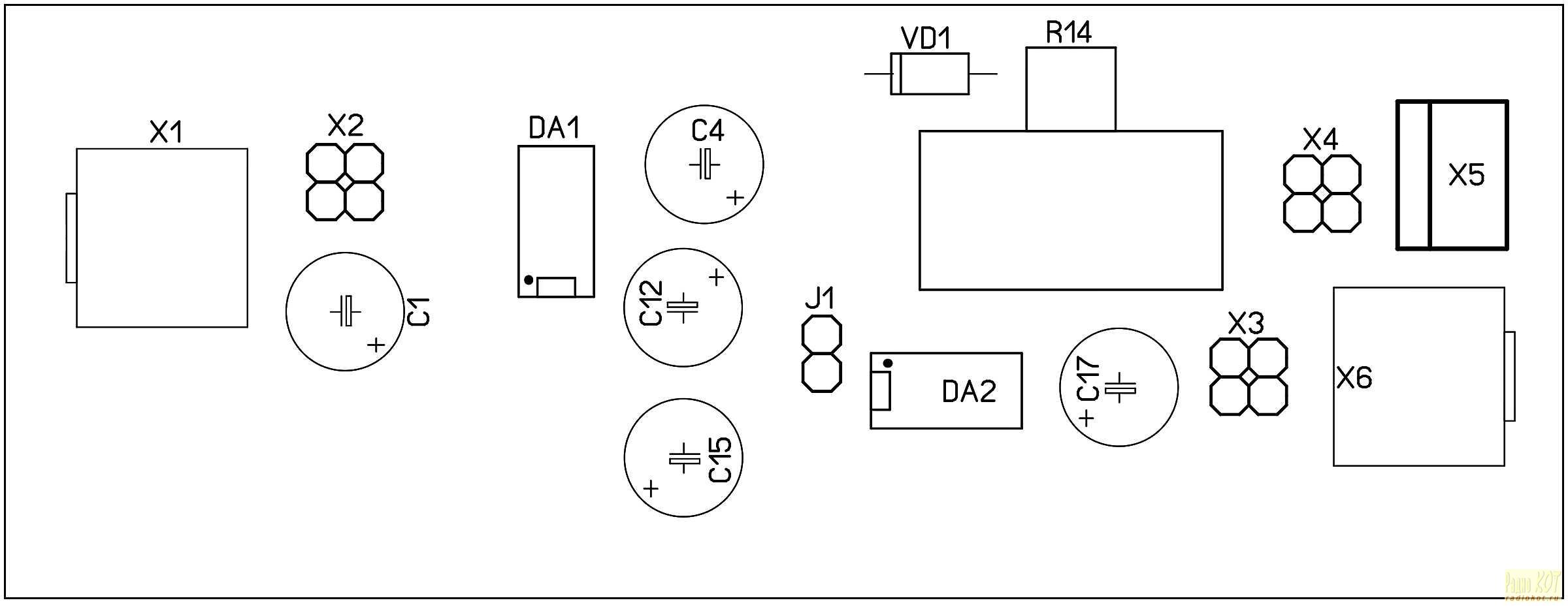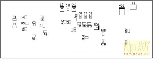 Тут следует отметить, что выводные компоненты устанавливаются с обратной стороны от проводящего рисунка, а компоненты для поверхностного монтажа – со стороны проводящего рисунка. При этом сборочный чертеж выполнен так, если бы мы смотрели на печатный узел как раз со стороны проводящего рисунка. Это необходимо учитывать при установке микросхем, диодов, а также полярных конденсаторов.