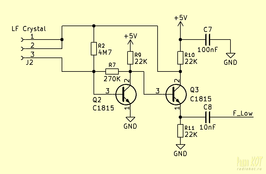 В общем, полуфабрикат. Пригодный, однако, при добавлении к нему кое-каких деталек, для трансформации в полезный инструмент. Попробуем провернуть это как жители Рисовой Вселенной - при помощи гумна и палок. Начнем. Итак, система питания. По мне странно полагаться на стабильность и качество источника, о котором известно только что он подключается через "бочку" ~3.8мм! Cам собой просится какой-нибудь стабилизатор, хотя бы линейный. И что удивительно, такой в схеме есть. Вот только питает он микроконтроллер и индикаторы, а генератор подключен непосредственно ко входу. Рабочая лошадь импульсных стабилизаторов напряжения эпохи расцвета микрочиповских копролитов серий PIC12Х и PIC16Х - MC34063. Её частенько можно встретить во всяком электронном хламе, порой даже неподалеку от самих пиков на той же доске и уже со всем обвесом - возьмем на заметку. В дополнение, и линейный стабилизатор у нас уже есть: HT7550-1, заботливо вложенный Рисовой Вселенной в пакетик с конструктором. Опыт подсказывает: линейный стабилизатор после импульсного частенько снимает головную боль от самовозбуждения входных усилителей и запуска генераторов не на тех частотах, на которых ожидаешь. Ну и сам входной разъём... у меня источников с таким не нашлось вообще: какие-то чуть больше, какие-то чуть меньше. А вот на 12В с бочкой ~5.5мм - завались. И гнезда такие в загашниках есть. Добавим индикатор наличия питания - красный светодиод, обёрнутый синей изолентой, не стоящий практически ничего и совершенно ненужный в обыденной жизни, но такой полезный при сборке и наладке - и соберем всё вместе: Ленящийся распаивать MC34063 с обвесом или просто не нашедший её - да соединит JP3 и пустит входной ток прямо на линейный стабилизатор (не забыв увеличить R14), сомневающийся в нагрузочной способности HT7550-1(спойлер: справляется) - да установит вместо нее распространенную LM7805 на 1A, убежденный в достаточности одного импульсного стабилизатора - да заменит R12 и R13 на выходное напряжение 5В(~3.6K и ~1.2К). Позаботимся о защите входа микроконтроллера. Простейшая схема на КТ368, взятая из архива схем входных усилителей-формирователей откуда-то с просторов наших интернетов показаля себя на удивление годно для такого применения(средний уровень на выходе - как раз посередине границ триггера Шмитта на входе пика - 2.5В) и была взята за основу - с переделкой на С9018(SS9018, как в генераторе у китайцев): Генераторы подключаются ко входу кнопками. Усилитель на биполярном транзисторе не ловит(ну, почти) всё то, что пролетает в воздухе мимо входа, а генераторы подключаются к нему примитивно и грубо - механическими контактами по мере необходимости. Примитивно, но надежно. И заводскую прошивку ради переключения входных каналов менять не надо. Практика показала: передавать сигнал даже после усилителя на входные контакты платы частотомера плоским шлейфом от дисководов/IDE жестких дисков (и даже экранированной жилой из аудио-проводка от CD-ROM) совсем не комильфо - на высоких частотах бОльшая часть теряется по дороге и уже не достигает граничных уровней(1В и 4В) триггера Шмитта на входе пика. Зато с этим справляется тонкий коаксиальный волновод неизвестного происхождения, вероятно от wi-fi антенны. На красной плате - помимо соединения цепей питания на месте снятых элементов - крайне желательно завести волновод непосредственно на выводы микроконтро