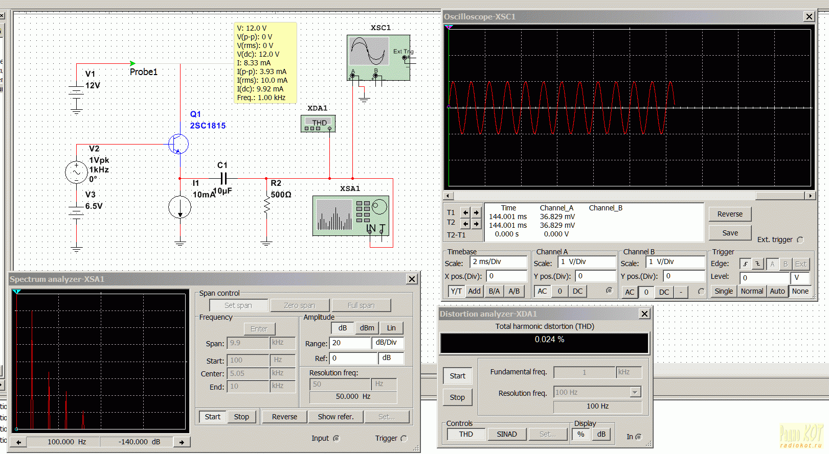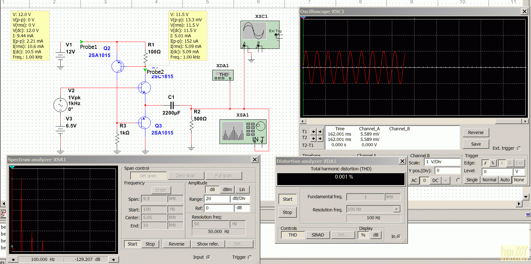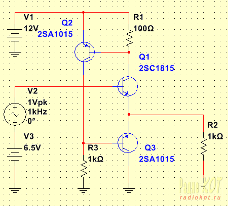Автор: misterzu В этой статье я постараюсь проанализировать проблему линейности каскада, построенном на транзисторе, включенном по схеме с общим коллектором: ..и придумать что с ней можно поделать. Такой каскад так же известен под названием “эмиттерный повторитель” и обычно используется как буфер между высокоомным источником сигнала и низкоомной нагрузкой. Он не изменяет амплитуду сигнала, но возможность подключения более низкоомной нагрузки при той же амплитуде означает усиление мощности, так что этот каскад, как и другие типы транзисторных каскадов, является усилительным. Его часто можно встретить в схемах УНЧ, стоящим в качестве входного буфера. Так же существует множество любительских и не очень конструкций усилителей для головных телефонов, “сердцем” (точнее – выхлопом J), а то и единственным органом которых и является эмиттерный повторитель, построенный на одиночном или составном транзисторе. Начнем с определения линейности усилительной цепи. Надо признаться, я сейчас загуглил этот термин в поисках откуда бы стырить красивое объяснение этого простого вроде бы по своей сути понятия – и с ходу не нашел такого. Так что придется писать самому. Задача усилителя (если он усилитель, а не “улучшайзер”) заключается не только в том, чтобы повысить мощность сигнала, но и одновременно максимально сохранить его “форму”. Это значит к примеру, если у нас есть усилитель напряжения, усиливающий напряжение в 2 раза, то в штатных условиях он должен его усиливать именно в 2 раза, независимо от того какой именно величины в него пришел сигнал и какое сопротивление (из допустимого диапазона) имеет нагрузка, подключенная к его выходу. К примеру, рассмотрим гипотетический не идеальный усилитель, выполненный по идеологии УПТ (это значит что он может усиливать не только переменный, но и постоянный сигнал. Так проще.. объяснятьJ), и мысленно подадим ему на вход 0.1В – померяем мысленным вольтметром что на выходе – мысленно допустим, что вольтметр показал 0.1995В. Затем подадим на вход уже 1В, а на выходе при помощи того же вольтметра обнаружим 1.92В. Это значит что наш гипотетический усилитель не смог идеально выполнить свою задачу. Сигнал 0.1В он усилил в 1.995 раз, а сигнал в 1В – он усилил в 1.92 раза. Нелинейность таким образом составила примерно 1 - (1.995/1.92) = 0.039, или 3.9%. По меркам УНЧ – это просто ужасно много. Такое не прощается никаким УНЧ, кроме ламповых J. Потому этот воображаемый девайс, который выполнил свою задачу в качестве виртуального подопытного - мы так же мысленно отправим в топку. Вернемся к эмиттерному повторителю. Казалось бы, раз он повторитель, то напряжение на его выходе просто повторяет напряжение на входе, а значит такие проблемы его не должны касаться. Возьмем супер-хороший вольтметр, соберем схемку, проверим - упс… Как же так? Чтобы разобраться - откроем даташит на какой-нибудь транзистор. Например, “народный” BD139. Мне первым нагуглился даташит производителя “Fairchild”. Пролистаем страничку с автопортретом транзистора, ненадолго остановимся на табличке “ Electrical Characteristics”: Первое что бросается в глаза - всякие цифры, например: напряжение насыщения коллектор-эмиттер, прямое напряжение на переходе база-эмиттер и коэффициент передачи по постоянному току и некоторые другие, совершенно не касающиеся обычного эмиттерного повторителя. А втора
