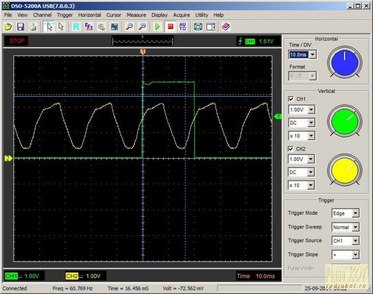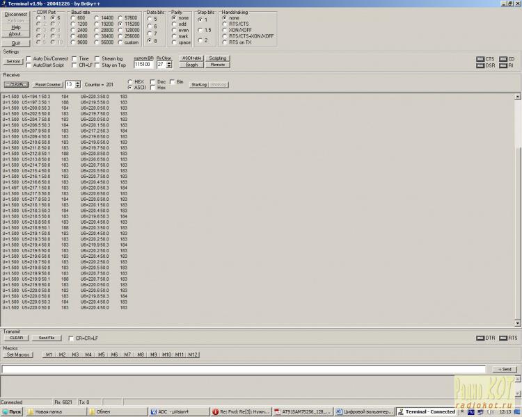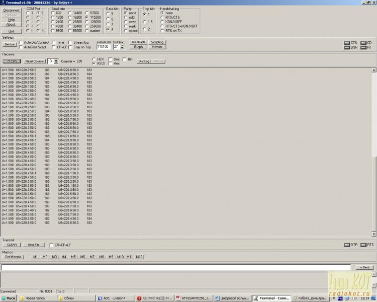 Автор: Димон Безпарольный, dshabroff@mail.ru Цифровой вольамперметр на микроконтроллере ляжет в основу менеджера нагрузок. Предыстория такова - во многих дачных домах ограничено потребление электричества. У меня ограничение - 2.2КВт. При этом в хозяйстве куча водонагревательных приборов и электроинструмента. Идея такова - отключать по протоколу X32 нагрузки с низким приоритетом в пиках потребления. Например, включили чайник 2КВт - отключился автоматически водонагреватель душа. И подключился вновь после отключения чайника. Для работы такого менеджера необходимо измерять ток нагрузки. Заодно хотелось бы измерять напряжение, частоту и фазу, вычислять COS F. Пока реализованы измерения напряжения и частоты. Ток предполагается измерять недорогим токовым трансформатором AC - 1020. Хотя говорят что ТТ весьма нелинейны. Прибор измеряет действующее значение напряжения по двум каналам по формуле: Метод измерения, описываемый формулой - сумма квадратов выборок за период сетевого напряжения. Такой метод дает наибольшую точность при измерении сетевого напряжения искаженной формы. Некоторые авторы в своих статьях измеряют напряжение, стробируя при помощи таймера. Полагая что частота сети всегда равна 50Гц. Такой метод дает дополнительную погрешность. В приборе применен другой метод - отслеживание напряжения в канале. При этом отбрасывается нулевая зона, в начале и конце периода. Именно в этой зоне присутствует максимум помех из - за работы тиристорных приборов, переключающих нагрузку при переходе через нуль. Измеренное значение усредняется при помощи метода скользящего среднего из 8 выборок измеренного и вычисленного напряжения V(формула). Схема Аналоговая часть. Схема в архиве. PCAD2006. Опорное напряжение - 3В, получаемое от ADR395 через повторитель на ОУ. Все аналоговые каналы (3) подключены к процессору через повторители на ОУ. На ОУ заведена средняя точка (1.5В). Относительно этой опоры заводятся два напряжения. В проекте применены Rail to Rail ОУ AD8628, в конечном продукте планируется применить счетверенные AD8643. Прибор питается от одного маломощного трансформатора через один выпрямительный диод (ток потребления 110ма). Это же напряжение подано на измерительные каналы. Поэтму на осциллограмах всегда срезана положительная полуволна напряжения. Цифровая часть пока не приводится. Процессор AT91SAM7s128. Если будет интерес - приведу, но там все стандартно. В проекте применяется четырехстрочный символьный дисплей PC2004LRSCNH. Стандартный на HD44780. UART c внешним миром общается через FT232. О программе. Программа построена с максимальным использованием прерываний. Ядро и периферия работают на частоте 48МГц. Опорный кварц 16МГц. Можно применять любой кварц - PLL имеет множитель и делитель, позволяющие довольно гибко оперировать частотами. В крайнем случае потребуется изменить множитель UART(который имеет и дробную часть). Частота работы остальной переферии и ядра некритична и должна быть меньше 50МГц. UART В проекте применен кольцевой буфер UART отдельно на прием и передачу. Прием и передача в порт осуществляется через соответствующие прерывания. Парсер команд обрабатывает пока только команды BEEP и Reset. Добавить что - то свое довольно просто. UART настроен стандартно 8n1 115200 (48 000 000/16/26 = 115385). PWM В проекте имеется пищалка с использованием одного канала PWM. АЦП АЦП в проекте работает также через прер