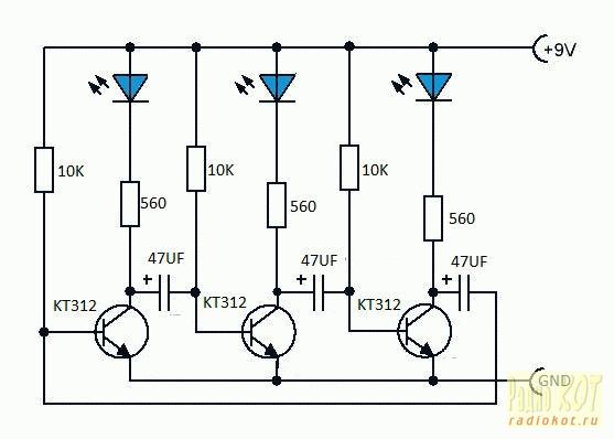 Автор: TERAVOLT, finit222@mail.ru Налаживать не нужно,главное протирать плату после пайки от флюса и не опускать емкость электролитов ниже 22мф.Во всем остальном схема не особо критична.Питание можно подавать от 6в до 14в.Моей целью было использовать скопившиеся у меня транзисторы кт312.На схемах я их не встречал вот и решил прилепить в мультик))что касается транзисторов,то они тоже не критичны,подойдут буквально любые маломощные н-п-н транзисторы (кт315,кт3102,кт815 ит.д)только следует соблюдать цоколевку.Можно ставить и п-н-п транзисторы,но для этого нужно изменить полярность питания,полярность конденсаторов и светодиодов.т.е. поменять местами плюсы и минусы и тогда можно ставить любые п-н-п (кт361,кт3107,кт814 и т.д)Я вкладываю 100% рабочуюю печатку,но она сделана под кт312!Там уж можно изменить под нужные вам транзисторы одним взмахом мышки)на этом пожалуй закончу,если будут траблы то гоу на форум ну или в крайнем случае прошу в ЛС.Успехов и приятных впечатлений,искрене вашь ТЕРАВОЛЬТ.