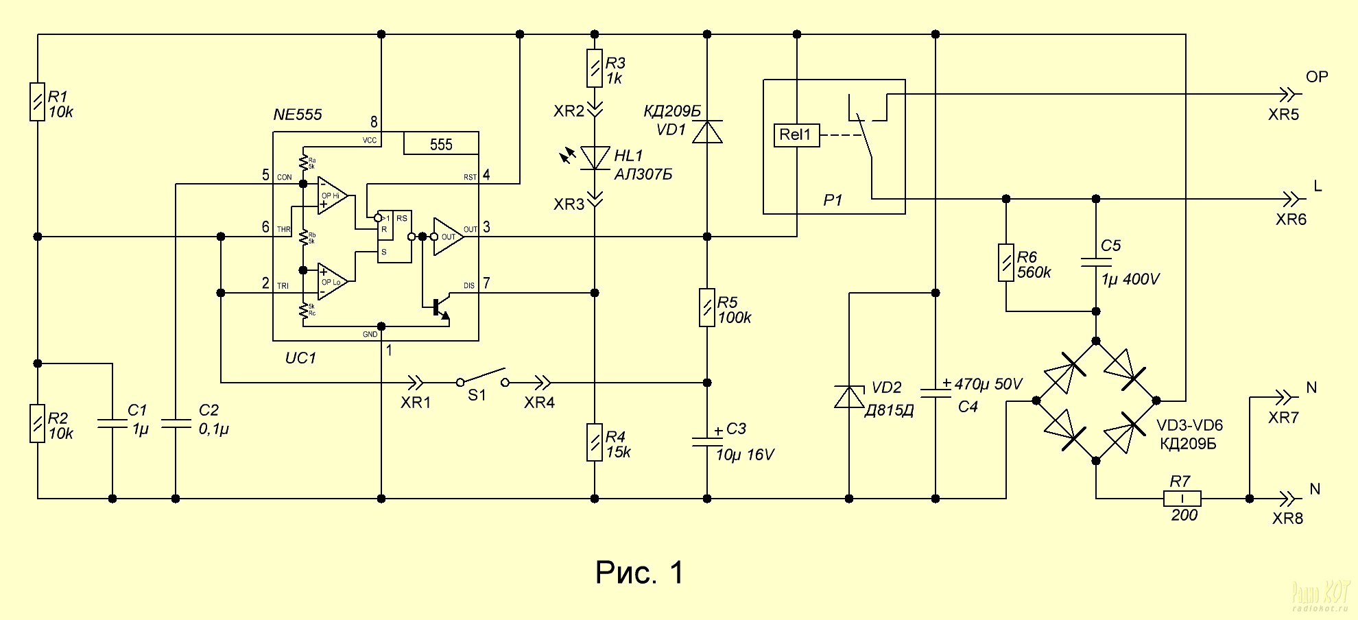 Автор: Энтомолог, egor-palunin@rambler.ru Казалось бы, нет ничего проще, чем сетевая кнопка! Но иногда хочется чего-то такого… чего-то другого… чего-то такого, как не у всех. И если во всем остальном мы горазды, то сетевая кнопка всех ровняет. Шутки шутками, но иногда сетевая кнопка действительно доставляет массу хлопот. Например, когда ее надо разместить на передней панели устройства, и сетевые провода тащатся через весь корпус, наполняя его фоном 50 Герц. Или брутальный щелкающий тумблер не вписывается в концепцию дизайна устройства. Может возникнуть ситуация когда сетевой кнопке будет недоставать интеллектуальности. Например, при сопряжении какого-либо устройства или старого советского измерительного прибора с компьютером. В этом случае нас может выручить электронная сетевая кнопка. В основе «электронной кнопки» (рис. 1), как это ни странно, лежит кнопка - S1. Обычный «микрик», без переключения (тройника), без фиксации, который можно комфортно разместить на передней панели устройства, снабдив элегантной клавишей. Можно встретить подобные кнопочные переключатели, совмещенные конструктивно с индикаторным светодиодом (рис. 2) и разных видов исполнения. Для «печатного» монтажа (рис. 2.а), и более солидные, антивандальные (рис. 2.б). У последних, кроме всего прочего, неплохой дизайн. В общем, выбрать есть из чего. Ну а самым главным элементом «электронной кнопки» является легендарный таймер NE555. В нашей конструкции он выполняет функции триггера, компаратора уровня, силового ключа, для управления исполнительным реле. Управляет светодиодом двухрежимной индикации состояния «кнопки» (включено/ярко, выключено/тускло), а также выполняет ряд специфических для простой сетевой кнопки функций. Теперь давайте по порядку. Компаратор уровня, точней два компаратора, интегрированы в сам таймер со всеми цепями обвязки необходимыми для задания порогов срабатывания. Типовые значения уровней срабатывания компараторов составляют - 1/3Uпит для компаратора нижнего порога переключения и 2/3Uпит для компаратора верхнего порога переключения. Каждый из компараторов управляет RS триггером, который тоже интегрирован в сам таймер. Компаратор, срабатывающий по нижнему уровню напряжения, переключает встроенный триггер в состояние Set (установлено), а компаратор срабатывающий по верхнему уровню, устанавливает триггер в состояние Reset (сброшено). Выходной сигнал таймера полностью соответствует состоянию внутреннегоRS триггера. Так, при состоянии Set на выходе таймера высокий уровень, при состоянии Reset низкий. Исполнительным реле управляет выходной драйверный каскад таймера. Выходной ток этого каскада может достигать 200 mA, чего вполне достаточно для включения небольшого реле. Высокий уровень напряжения на выходе драйвера, равен напряжению питания схемы, за минусом 1,7 Вольт (типовое значение). Низкий, порядка 0,3 Вольт. Стоит помнить, что напряжение низкого уровня зависит от втекающего тока. Яркостью светодиода управляет тоже таймер. Для этого используется интегрированный в микросхему транзистор, предназначенный, в оригинальном включении, для разряда времязадающего конденсатора (Discharging). В нашем случае он используется как еще один выход таймера с открытым коллектором. В состоянииSet транзистор закрыт, а в состоянии Reset, сигналом логической единицы с инверсного выхода RS триггер