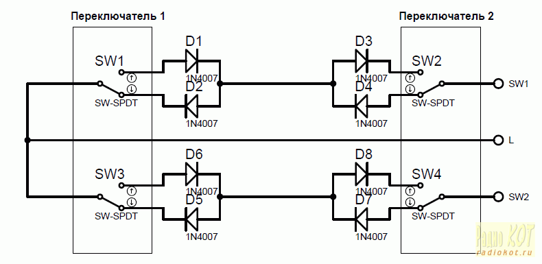 Если просто подавать полуволну после прохождения напряжения сети через два диода на нагрузку, то лампочки накаливания будут заметно мигать, да и яркость и эффективность их заметно падает. Поэтому решено было собрать схему которая будет совмещать в себе достоинства обоих вариантов, а именно - питать лампы полной синусоидой сетевого напряжения реализуя управления двумя двойными прохордными переключателями через коммутацию встречно включенных диодов. Схема состоит из двух частей: схемы включения проходных переключателей в стенах и схемы самого устройства управления. Схема включения проходных переключателей: На вход приходит три провода: L - фаза, SW1 - полуволна управления первой лампой, SW2 - полуволна управления второй лампой. Каждый из переключателей переключает один из двух встречно включенных диодов. Два проходных переключателя включены последовательно, поэтому если полярность обоих коммутируемых диодов совпадает, то на выходе (SW1 или SW2) появляется полуволна соответствующей полярности. Полуволна на выходах SW1 и SW2 подается не прямо на нагрузку, а на вход схемы управления: Смысл схемы управления в том, чтобы использовать полуволну на входах SW1 или SW2 для коммутации нагрузки. Для преобразования полупериодного напряжения сети используются две зарядки от старых телефонов (чуть разные, но очень похожие), вытянутые из родных корпусов и размещенные на общем основании. Формально зарядка рассчитана на 5V DC, но реально напряжение на выходе не стабилизировано, поэтому добавлен резистор, который согласует выход зарядки с используемым для коммутации нагрузки. Номинал резистора в моем случае составил 39 Ом, но на самом деле нужно посмотреть какое напряжение будет выдавать зарядка при токе потребляемом катушкой реле и подобрать соответствующее сопротивление для вашей зарядки и реле индивидуально (я использовал реле TAINBAO HJR-3FF-S-Z с сопротивлением обмотки 68 Ом, рассчитанное на номинальный ток в обмотке 73мА, при таком токе зарядка выдавала напряжение 7.8 Вольт, соответственно для его компенсации понадобился резистор 39 Ом). Изначально зарядки были рассчитаны на полупериодное питание (стояли диодные полумосты на входе). Но поскольку схема включения переключателей сама по себе уже подает только одну полуволну, но неизвестно какую, в полумост на входе зарядок были добавлены диоды, дополняющие его до полного моста, чтобы зарядки могли работать от любой из полуволн пропускаемых выключателями. В остальном схема и логика их работы не изменилась: В схеме можно использовать диоды (или диодный мост) минимальной мощности, т.к. ток в схеме управления не превышает 20мА. В результате получилось такое устройство (да, много проводов, поскольку использовались готовые платы от зарядок общая плата не делалась а все компоненты крепились на основу из тонкого текстолита и соединялись проводами, но в стене это не так важно, да и с "прямыми" руками всегда можно сделать лучше чем на картинке): Перед монтажом для каждого выключателя было заготовлено четыре комплекта диодных полумостов (упакованный в термоусадку на фотографиях). Смонтированные переключатели с диодными полумостами: Сам блок управления смонтирован в стене (пока еще не закрыт в распределительной коробке, т.к. ремонт еще в процессе): Работоспособность схемы проверена. Во включенном состоянии потребл