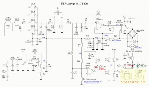 Схема разработанного ESR-метра приведена ниже: Питание прибора осуществляется от литиевого элемента GB1 CR2032. Резистор R1 предназначен для ограничения начального броска тока через незаряженные ёмкости конденсаторов C1, C4 при включении питания. Диод VD1 1N4007 служит для защиты от подачи питающего напряжения в обратной полярности. На микросхеме DA1 LP2951CM выполнен стабилизатор напряжения +2 В, от которого питается основная часть схемы. Эта микросхема представляет собой микромощный регулируемый стабилизатор напряжения Low Drop с максимальным выходным током 100 мА. Задающий генератор частотой около 80 кГц собран на микросхеме DD1 74HC04D, четыре инвертора которой запараллелены для увеличения выходного тока. Прямоугольные импульсы с выхода генератора размахом 2 В подаются на делитель R5, R6, уменьшающий размах тестирующего напряжение до 30 мВ, что позволяет проводить измерения непосредственно в схеме, не опасаясь, что откроются p-n переходы присутствующих в ней полупроводниковых приборов. С нижнего плеча делителя ограниченные по амплитуде импульсы подаются на одну из обкладок тестируемого конденсатора. Вторая обкладка через резистор R7 соединяется с общим проводом схемы. На этом резисторе выделяется падение напряжения, обратно пропорциональное внутреннему сопротивлению проверяемого конденсатора. Диоды VD2…VD6 служат для защиты прибора от повышенного напряжения при проверке заряженного конденсатора. Переменная составляющая напряжения с R7 подаётся на инвертирующий усилитель DA2.1 с коэффициентом усиления по переменному напряжению около 8 (определяется в основном отношением сопротивлений резисторов R14/R8). Неинвертирующий вход DA2.1 подключен к виртуальной земле, сформированной при помощи R13, VD7, VD8, C10, C11. Усиленное переменное напряжение с выхода DA2.1 через разделительный конденсатор C12 поступает на двухполупериодный выпрямитель, выполненный на второй части ОУ DA2.2. В качестве нагрузки выпрямителя использована стрелочная головка микроамперметра PA1 М68501 от старого кассетного магнитофона. Головка имеет внутреннее сопротивление около 500 Ом и ток полного отклонения 250 мкА. Средний ток через головку определяется отношением средневыпрямленного значения входного напряжения к сопротивлению Rос=R16+R20 [1]. Диоды моста VD9…VD12 – диоды Шоттки для уменьшения падения напряжения. Подстроечный резистор R16 предназначен для установки стрелки прибора на нулевое деление шкалы. Детектор утечки по постоянному току выполнен на компараторе DA3.1 LM393D. Исправный проверяемый конденсатор не пропускает через себя постоянную составляющую подаваемых на него прямоугольных импульсов. Переменная составляющая отфильтровывается ФНЧ R9, C7, поэтому на инвертирующем входе компаратора DA3.1 присутствует нулевое напряжение. На неинвертирующем входе DA3.1 присутствует некоторое положительное пороговое напряжение, заданное делителем R11, R12, поэтому на выходе компаратора высокий уровень и сигнальный светодиод HL1 не светится. При наличии утечки в проверяемом конденсаторе на инвертирующем входе появится напряжение, величина которого будет пропорциональна току утечки. При превышении на инвертирующем входе порога, заданного делителем R11, R12, на выходе компаратора установится низкий уровень, и светодиод HL1 своим свечением просигнализирует о наличии утечки. Индикатор состояния элемента питания в