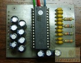 На фото выше показан блок управления и блоки аудиопроцессоров. Блок управления собран на микроконтроллере PIC16F628A , блоки аудиопроцессоров собраны на TDA7313 (или TDA7318) (на фото слева внизу) и на TDA7439 (справа внизу). Ниже фото блока управления.