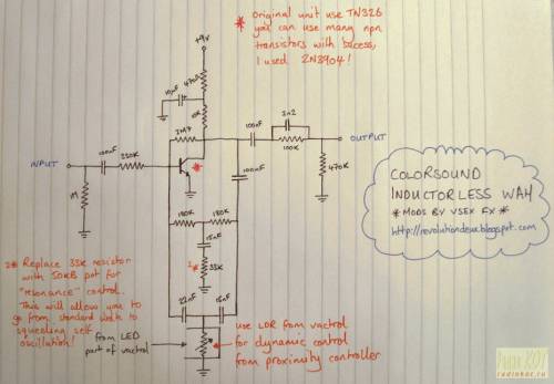 Рылся по интернету в поисках эффекта Wah-Wah, но вся их сложность заключалась в механизме педали Наткнулся на бесконтактный квак, и это меня очень заинтересовало вот схемы: Давайте теперь разберёмся, как оно работает. Антена: Там стоит генератор на триггерах Шмитта Частота задаётса как раз емкостью антена-земля. Когда вы играете на электрогитаре, то пренепременно касаетесь струн, которые заземлены. Вот и нога, которую подносите к антене заземлена. Меняя частоту, меняется яркость светодиода. Квак: Здесь стоит Т-образный пробка фильтр в обратной связи. Т.о. сам фильтр вырезает небольшой кусок из АЧХ, а т.к. он стоит в ООС, то этот вырез и усиливается. "Да это же полосовой фильтр!", скажете вы. Да, это полосовой фильтр. Получается что-то в виде пика. Частота зависит от фоторезистора. Связь между антеной и кваком осуществляется оптроном (в оригинале), но можно использовать светодиод+фоторезистор. Антена должна быть в виде пластины Вот, что получилось у меня: Т.к. нужных номиналов не нашлось, ставил другие, пересчитывая фильтр В приложенос архиве - схема (с моими изменениями) + печатка в Proteus 7.7 Я использовал КТ3107Л (с меньшей буквой некоректно работал сенсор) и всеми любимые КТ315Б Добавил переменный резистор (на схеме помечен 1*) https://www.youtube.com/watch?v=IVcZBjolJn8 - видео работы