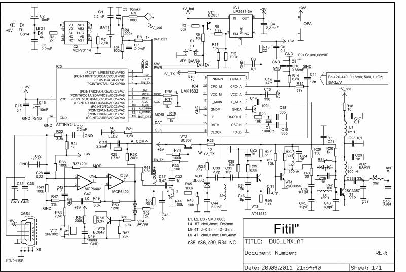 Итак, «поймали» частоту 424,2 мГц. Необходимо добиться, чтобы напряжение на конденсаторе С11 было близко к 1,5В. (вольтметр не должен быть низкоомным) После этого в катушку L5 помешаем маленький кусочек поролона или ваты и заливаем катушку каплей горячего парафина. Паяльником необходимо прогреть катушку, чтобы поролон пропитался. После этого необходимо установить экран. Из чего он сделан и где он стоит хорошо видно на фото. Необходимо только перед установкой сделать круглым надфилем неглубокие пропилы, чтобы исключить замыкание проводников, идущих в «подэкраное» пространство. Так-же необходимо учесть, что индуктивность L5 после установки уменьшиться. Поэтому через технологическое отверстие в экране необходимо будет слегка поджать витки катушки , контролируя напряжение на С11 (1,5В).