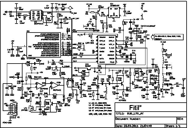 Устройство собрано на печатной плате из двустороннего стеклотекстолита толщиной 1,5мм.Размер платы - 59х44мм. Через все отверстия, указанные на рисунке печатной платы пропущен лужённый проводник диаметров 0,4 мм, который соединяет обе стороны печатной платы(«землю»). Исключение составляют отверстия под выводы кнопки, светодиодов . Эти отверстия с обратной стороны слегка «зенкуются» сверлом D=2-3мм. Так-же не следует замыкать выход антенны на «землю» :). Кнопка, светодиоды для удобства монтажа и настройки устанавливаются в последнюю очередь. Элементы С35, С36, С39, R34 не устанавливаются вообще, это технологические элементы, которые необходимы были для формирования на ПП контактных площадок, ВОЗМОЖНО понадобившихся при настройке. Так-же не надо сразу устанавливать катушку L6, резисторы R16, R17,R19.При сборке не следует использовать «злых» и «подарочных» флюсов, из-за которых потом тяжело вылавливать «глюки». Рулит канифоль, польская «Паста для лютовання» (типа баночки из-под крема) ну и то в чём вы уверены. Красный флюс-ЗЛО!!!!