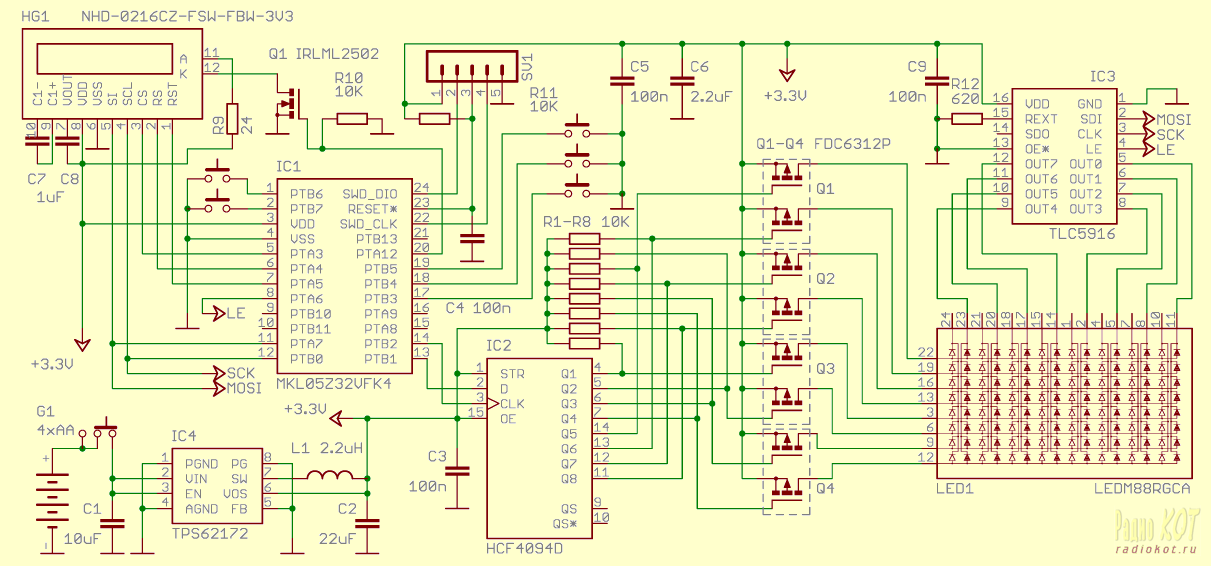 Автор: Сергей Безруков (aka Ser60) и Matthew Holcomb, sergeilb60@mail.ru Хотел я было начать статью словами типа кто в детстве не играл в такую игру на компе. Однако, спохватившись, осознал, что в моём детстве таких игр не было, как и вообще персональных компьютеров, а нынешнее поколение играло или играет в несравненно более продвинутые электронные игры. Тем не менее, сделать самому такую игру для себя или в подарок может быть кому-то интересно. Помимо всего прочего, это неплохой обучающий проект. Напомню кратко правила игры. На экране периодически появляются объекты в случайных позициях (мы их называем фрукты), которые “съедаются” змеёй, управляемой пользователем. Змея может двигаться только по вертикали или горизонтали и не допускается при движении выходить за пределы поля или пересекать тело змеи - в этих случаях игра будет закончена. При съедении фрукта длина тела змеи увеличивается и прибавляется некоторое количество очков к счёту. Цель игры - набрать как можно больше очков. Скорость движения змеи увеличивается в процессе игры и в начале её имеется возможность выбрать один из трёх уровней сложности. В Интернете легко ищутся реализации этой игры для компьютеров или смартфонов с красивой графикой. Однако, начинающим сделать что-то подобное не просто. В нашем случае вся графика реализована на 8×8 монохромной светодиодной матрице с CA, где фрукты индицируются одной точкой. Это был первый микроконтроллерный проект моего студента Мэтта, и мы решили поделиться нашей реализацией с сообществом. Сразу отмечу, что алгоритм игры и вообще её прототип были заимствованы из одного проекта на Arduino [1]. Мы переделали его под другую элементную базу и индикаторы, включая их управление. Плата на снимке выше расположена горизонтально для удобства чтения. В верхней части платы расположен LCD дисплей, на котором отображается текущий счёт игры и её состояние. При окончании игры на светодиодной матрице высвечивается крест, показанный выше. Начало игры производится нажатием на среднюю кнопку, остальные кнопки предназначены для управления движением головы змеи в соответствующих направлениях. Её туловище при этом следует траектории движения головы. Для получения растра на матрице используется динамическая индикация, при которой в каждый момент времени высвечивается один столбец матрицы. Смена столбцов производится каждую миллисекунду, что соответствует частоте обновления всего дисплея 125гц. Иррегулярная разводка выводов дисплея на схеме сделана с целью упрощения геометрии печатной платы. Драйвер матрицы IC3 задаёт ток каждого светодиода в столбце, определяемым сопротивлением резистора R12. При питании от батарей пришлось пойти на компромисс между яркостью матрицы и потребляемым схемой током. Кстати, матрица содержит пару светодиодов для каждой точки – красный и зелёный. Нами используется только один из них – зелёный, поскольку чувствительность глаза к зелёному цвету выше чем к красному, что позволило несколько уменьшить ток через светодиоды. Загрузка данных в драйвер производится по интерфейсу SPI на частоте 400кгц. После загрузки данных для очередного столбца формируется краткий строб на входе LE (Latch Enable), в результате которого принятые данные передаются в каскад управления светодиодами. Это исключает мерцание светодиодов в процессе загрузки данных в драйвер.