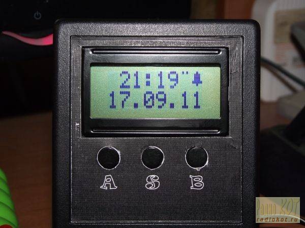 "УстВремя" - Установка времени. Установка времени происходит двумя кнопками "А" - устанавливает часы, "В" - устанавливает минуты. Следующее нажатие кн. "S" приводит к запоминанию времени, сбросу секунд в НОЛЬ(коррекция секунд) и переходу к следующему меню: