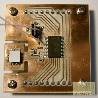 Измеритель собран на печатной плате размером примерно 4×4 см. После распайки деталей плата со стороны печатных проводников покрыта лаком для ногтей. Для уменьшения влияния температуры платы на датчик, вокруг него в плате выпилены пазы. Задняя и передние плексиглазовые панели сделаны чуть больше по высоте, чем плата для предотвращения касания платы с поверхностью, на которой установлен прибор. При окончательной сборке конструкции защитная пленка с датчика снята. Держатель батареи приклеен к задней стенке «корпуса» эпоксидным клеем. ЖКИ – модель VI-201-DP-RC-S фирмы Varitronix. Конденсатор C3 типоразмера 0805, остальные пассивные элементы – 0402. Файл платы для Eagle и исходный текст программы вместе с файлом проекта для IAR, а также HEX прилагаются.