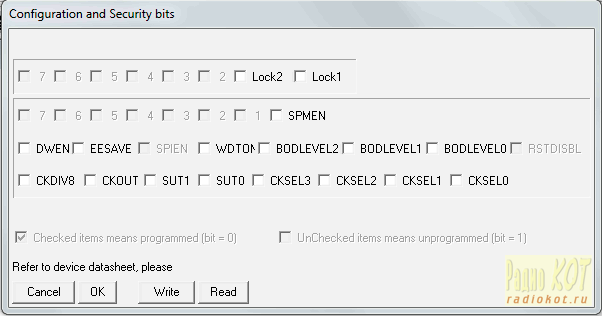 Все предустановки временных интервалов сохраняются в EEPROM, в случае обесточки схемы встроенный в микроконтроллер аналоговый компаратор надежно сохранит текущее состояние таймера и отсчитанные уже промежутки времени и при следующем включении таймера в сеть восстановятся, и таймер продолжит работу с прежнего места отсчета. Установка фьюз:
